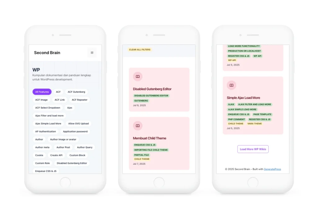 After struggling with Notion’s complexity for my second brain, I built this WordPress solution that gives me complete control over my knowledge organization. The four specialized custom post types and AJAX filtering make finding and organizing information much more efficient than my previous setup. Now I can quickly access web development notes, interactive components with live demos, WordPress customizations, and React.js features all in one organized system.